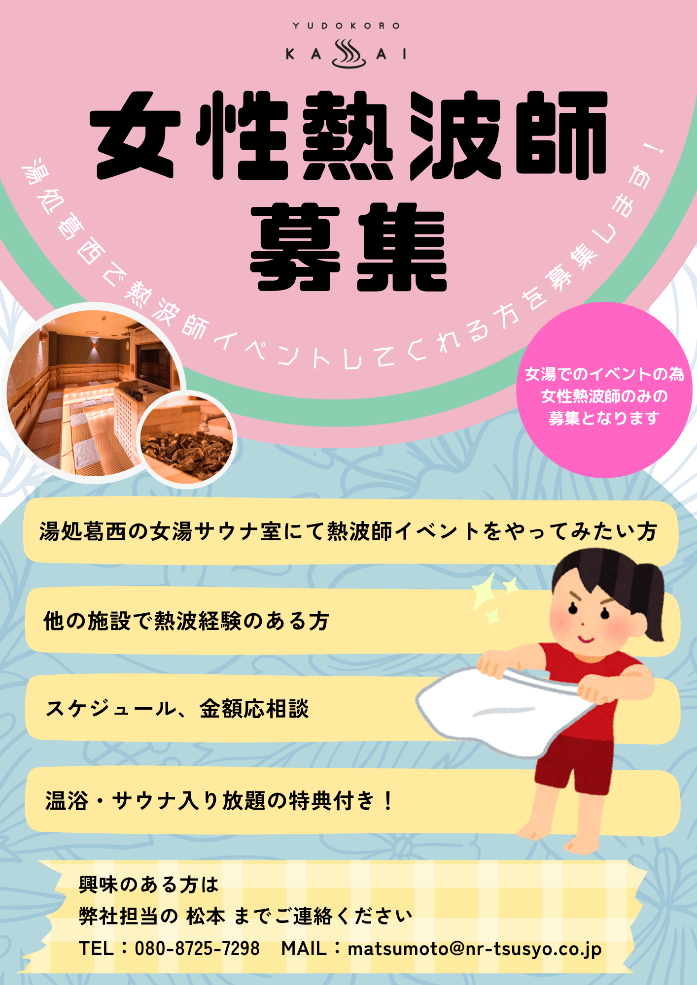 湯処葛西 女湯にて熱波師イベントをしてくれる方を募集しています!