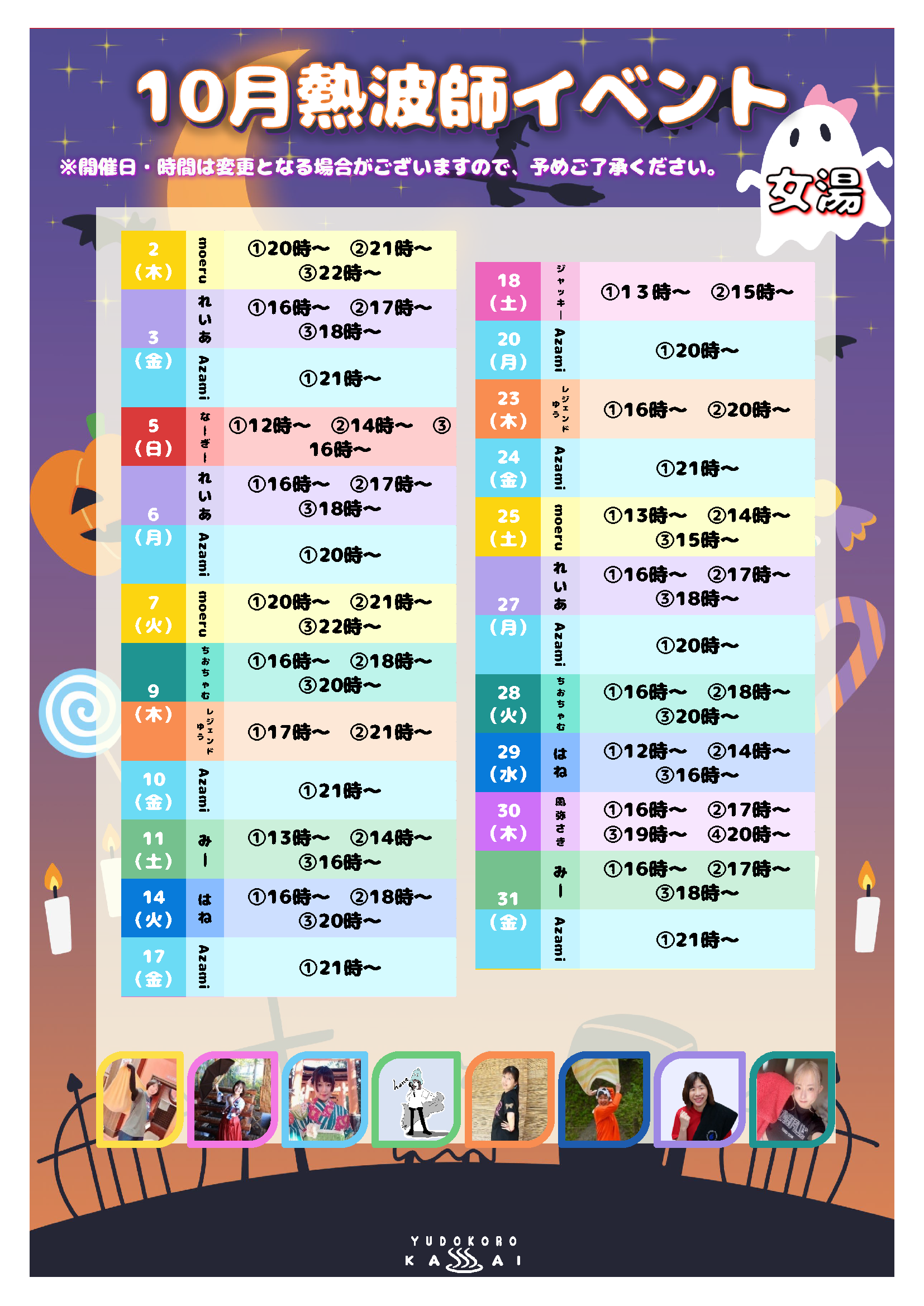 10/16(木)、17(金)に女湯にて開催予定の熱波師イベントですが、