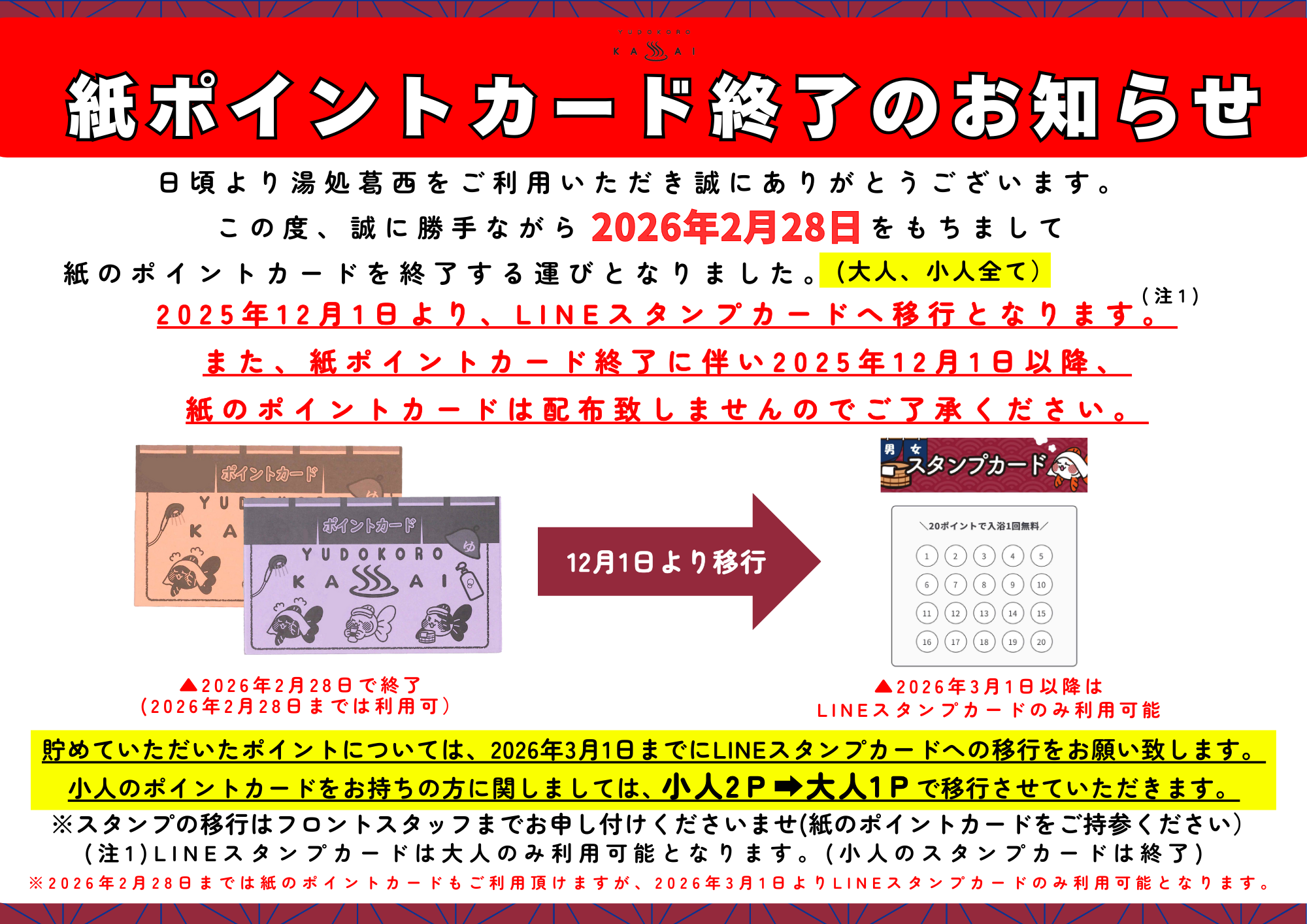湯処葛西公式LINEのLINEスタンプカードへ移行となります。
