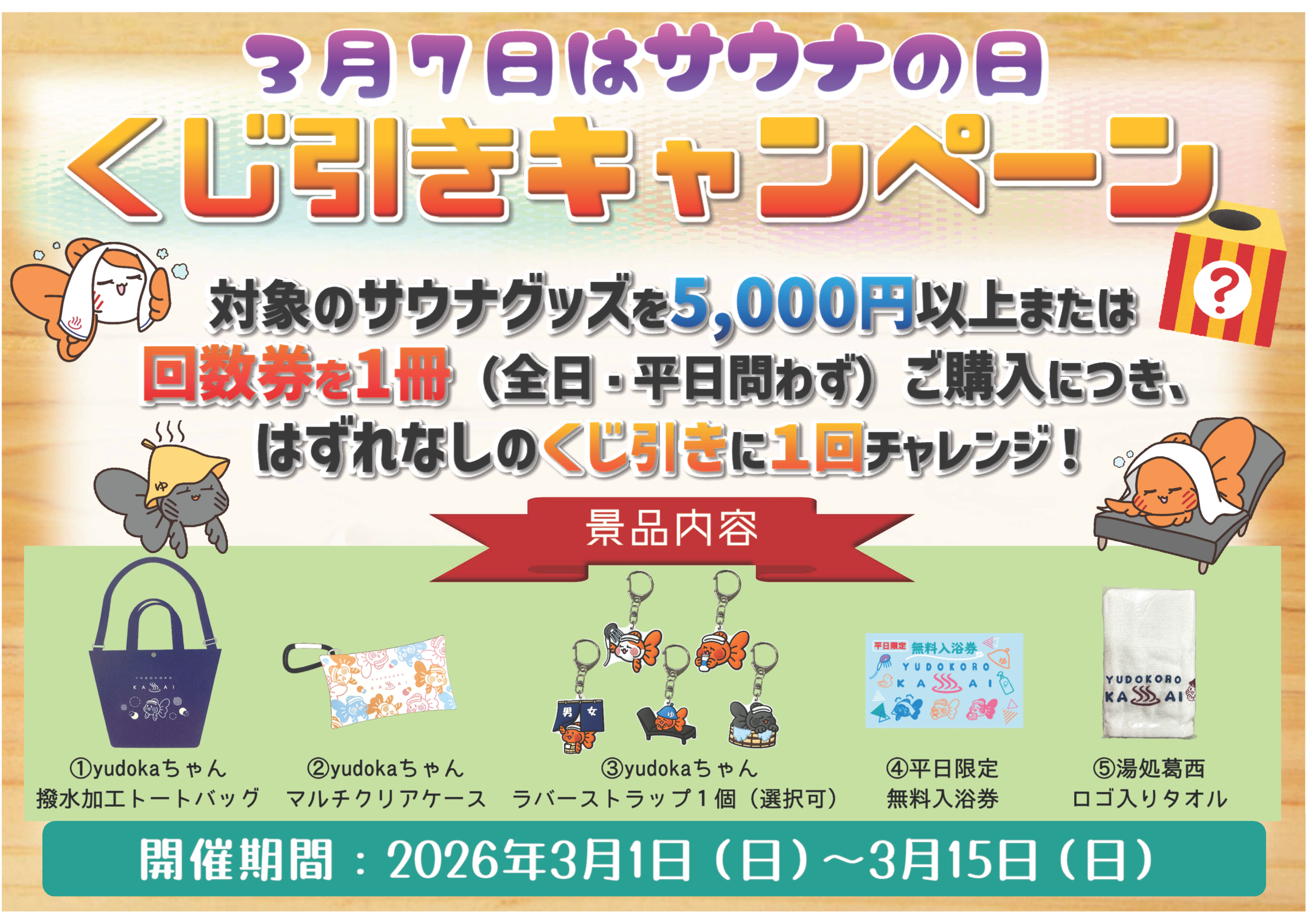 🗓 2026年3月1日(日)〜3月15日(日)期間中に対象のサウナグッズを5,000円以上ご購入または回数券(全日・平日どちらもOK)を1冊ご購入ではずれなしのくじ引きに1回チャレンジ✨何が当たるかはお楽しみ🎁🤗このチャンスをお見逃しなく!